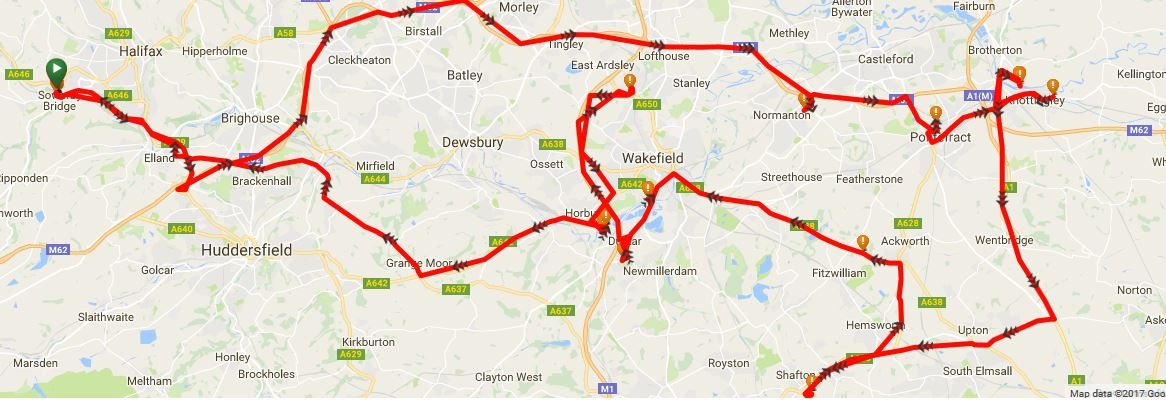 In his shift spanning from 6am until 3pm, John spent a total of 5 hours and 116 miles driving a loop from our base in Sowerby Bridge, to the Pontefract area and back.